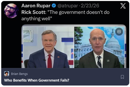Last week, I discussed an ignorant comment from a multi-millionaire U.S. Senator who was the former CEO of a corporation with the largest Medicare fraud fine in history. From Senator Rick Scott’s position of privilege, he opined on how “government messes up your life,” and “is always the problem.”