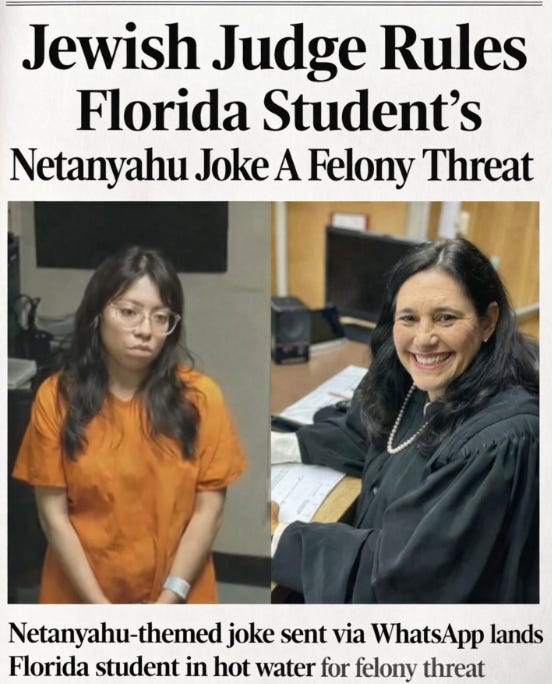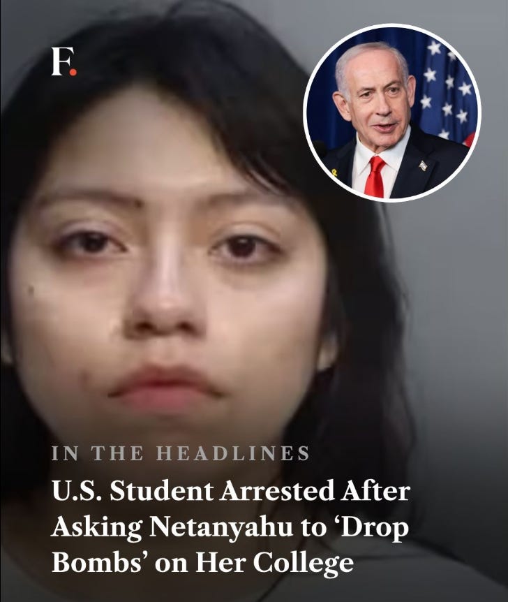 A Florida college student is behind bars and facing up to 15 years in prison after a joke about Israeli Prime Minister Benjamin Netanyahu in a private WhatsApp group led to her arrest on charges of making written threats to kill or do bodily harm.