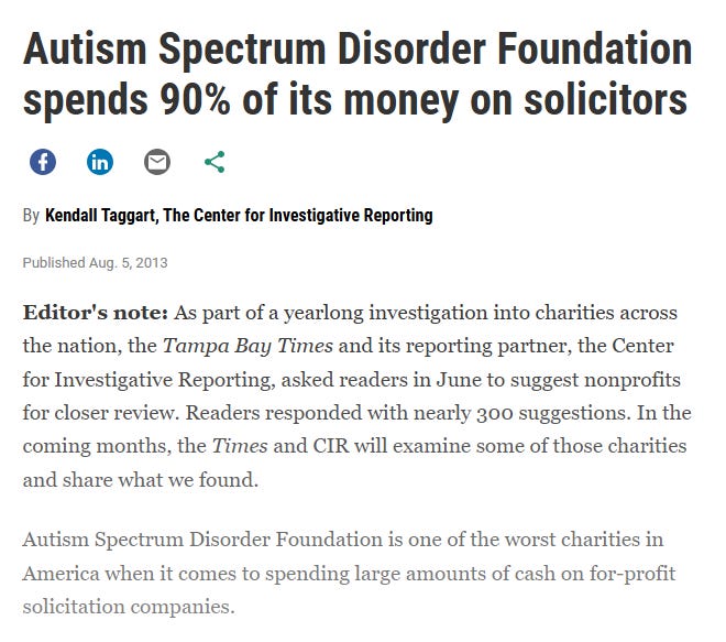 The charity- which also goes by the Autism Awareness Program and Autistic Children of America- writes on their website that the “funds donated to ASDF will be used to address any and all kinds of issues in assisting children with autism and their families.”