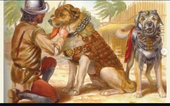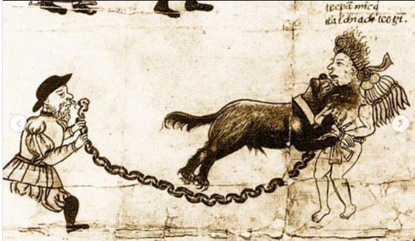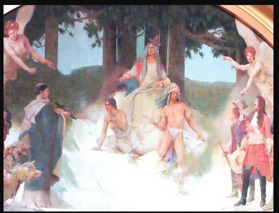 The mural’s central element depicts a half-naked Native man and woman trapped by the advance of white explorers, settlers, and their protective angels. A priest extends a cross, behind him another man restrains two attack dogs. The message is clear: convert or die.