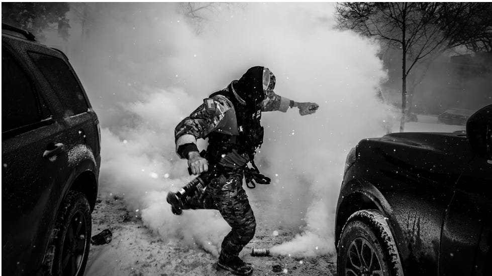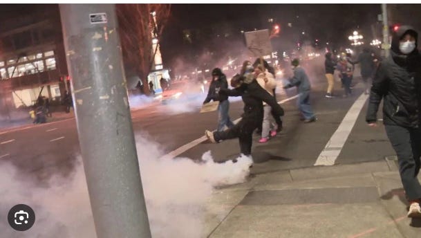 leaf blowers blowing the tear gas back.