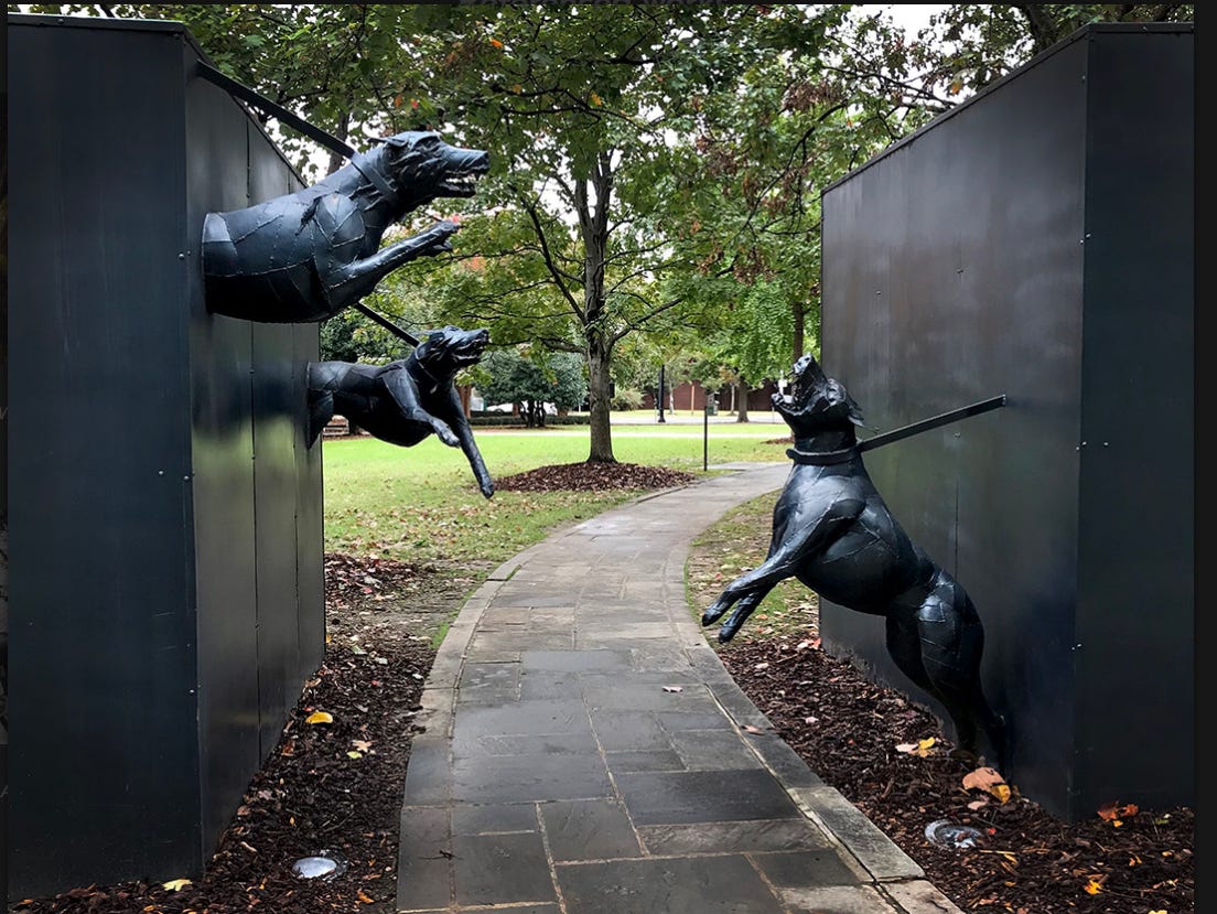 James Drake, Police Dog Attack, (1993). Bronze and steel sculpture, Kelly Ingram Park, Birmingham, Alabama.