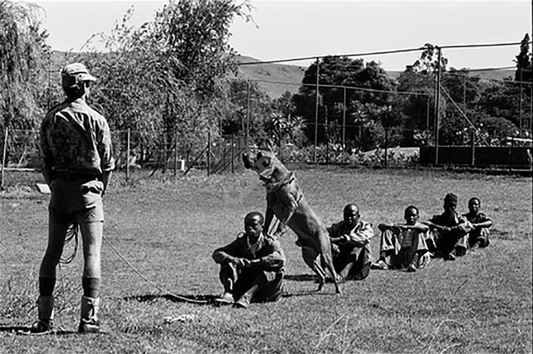 [Alon Reininger (photographer), Police academy dog training under Apartheid, March 1976. Photograph. Pretoria, South Africa.]