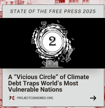 [The countdown continues for Project Censored’s highly anticipated reveal of the Top 10 Most Censored Stories of the Year! Coming in at #2: Low-income countries face a “climate debt trap,” struggling with climate-induced disasters and mounting debt, according to the World Resources Institute. These nations often borrow to fund climate resilience but are burdened by high-interest loans, short repayment periods, and compounding crises like pandemics and natural disasters. As debt surpasses 60% of GDP in many nations, governments cut essential services like health and food security, worsening poverty and public distrust. The Bahamas exemplifies this cycle, accruing billions in debt after hurricanes. Experts urge reforms like below-market-rate loans, debt cancellation, and contributions to the Loss and Damage Fund. Critics label current lending policies as a “new form of colonialism,” forcing nations to exploit fossil fuels to repay debts. While the issue has limited media coverage, independent outlets and studies have long warned of this crisis, emphasizing the urgent need for equitable financial solutions to aid climate-vulnerable nations.