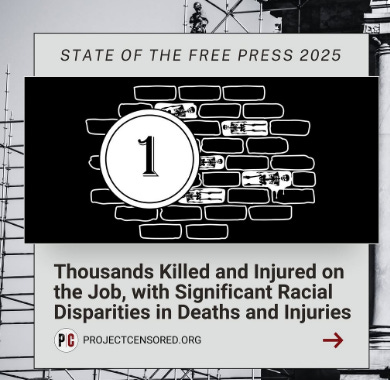[The countdown concludes with the #1 Most Censored Story of the Year, shedding light on a deeply critical issue: Thousands Killed and Injured on the Job, with Significant Racial Disparities in Deaths and Injuries